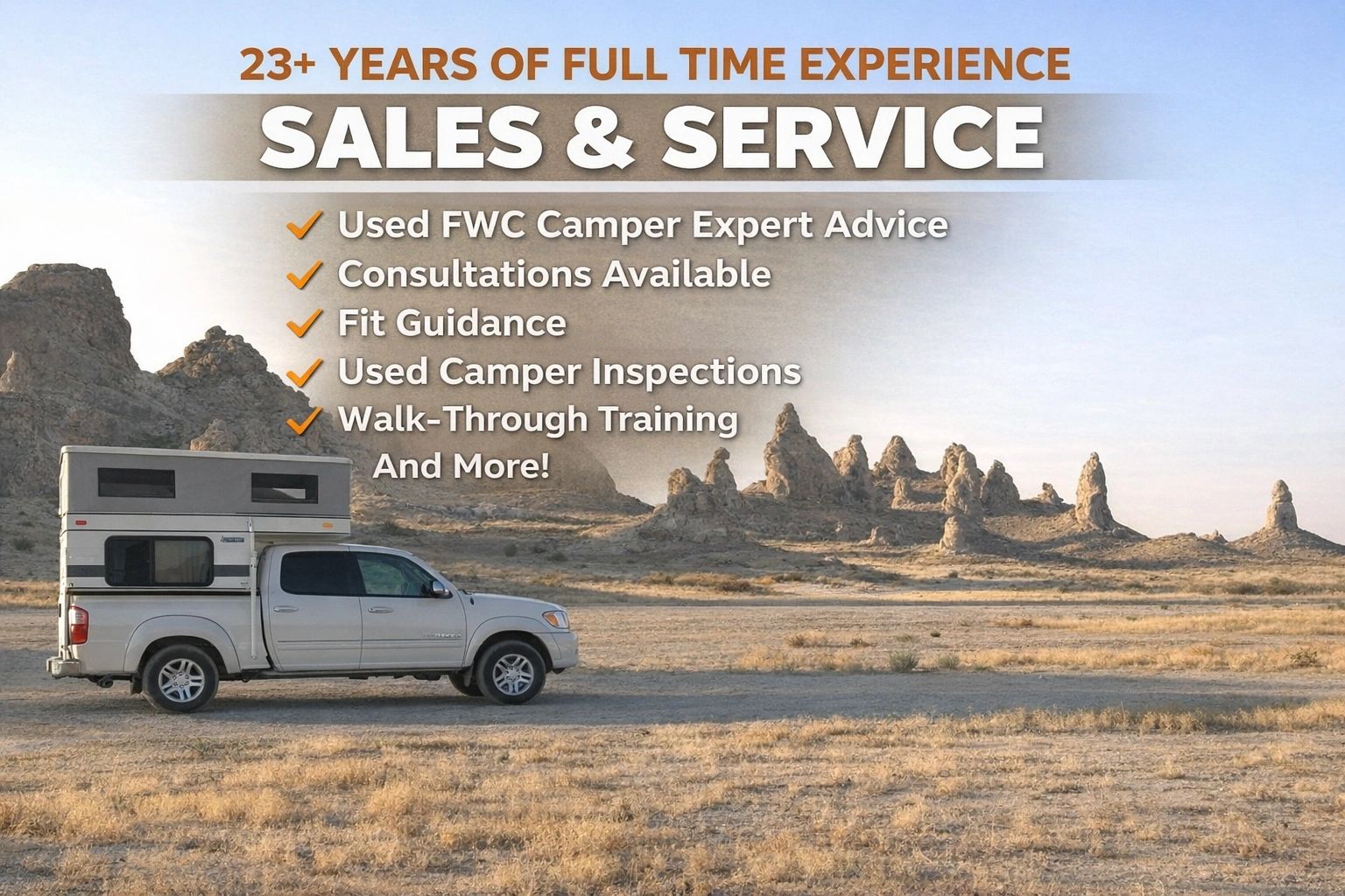 We are a small trusted independent shop specializing in all things pop-up truck camper related. We sell used FWC campers, we buy used campers, we work on used campers, and we can probably provide advice & guidance if you have questions or need help. 23+ years of full time experience working with new & used Four Wheel Pop-up Truck campers.